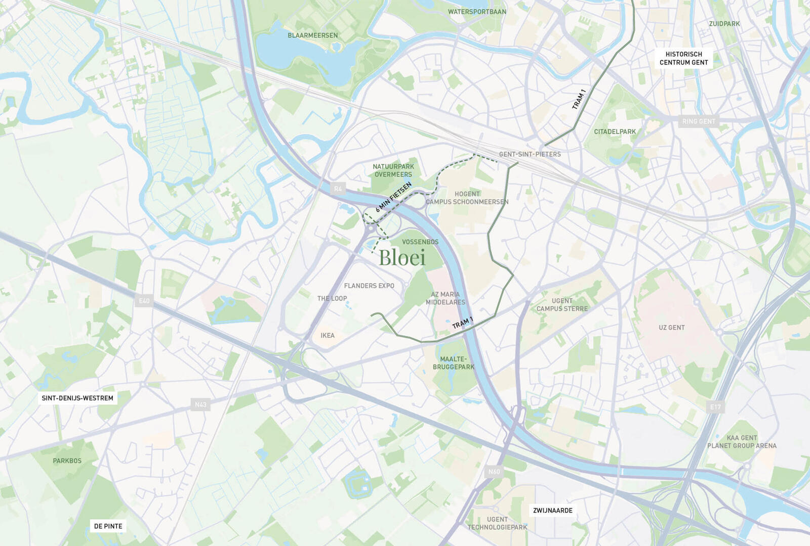 “Bloei” wordt opgetrokken tussen Gent-Sint-Pieters, “The Loop” en het AZ Maria Middelares. De stad Gent zal in dit projectgebied de komende jaren investeren om een nieuw en levendig stadsdeel te creëren.