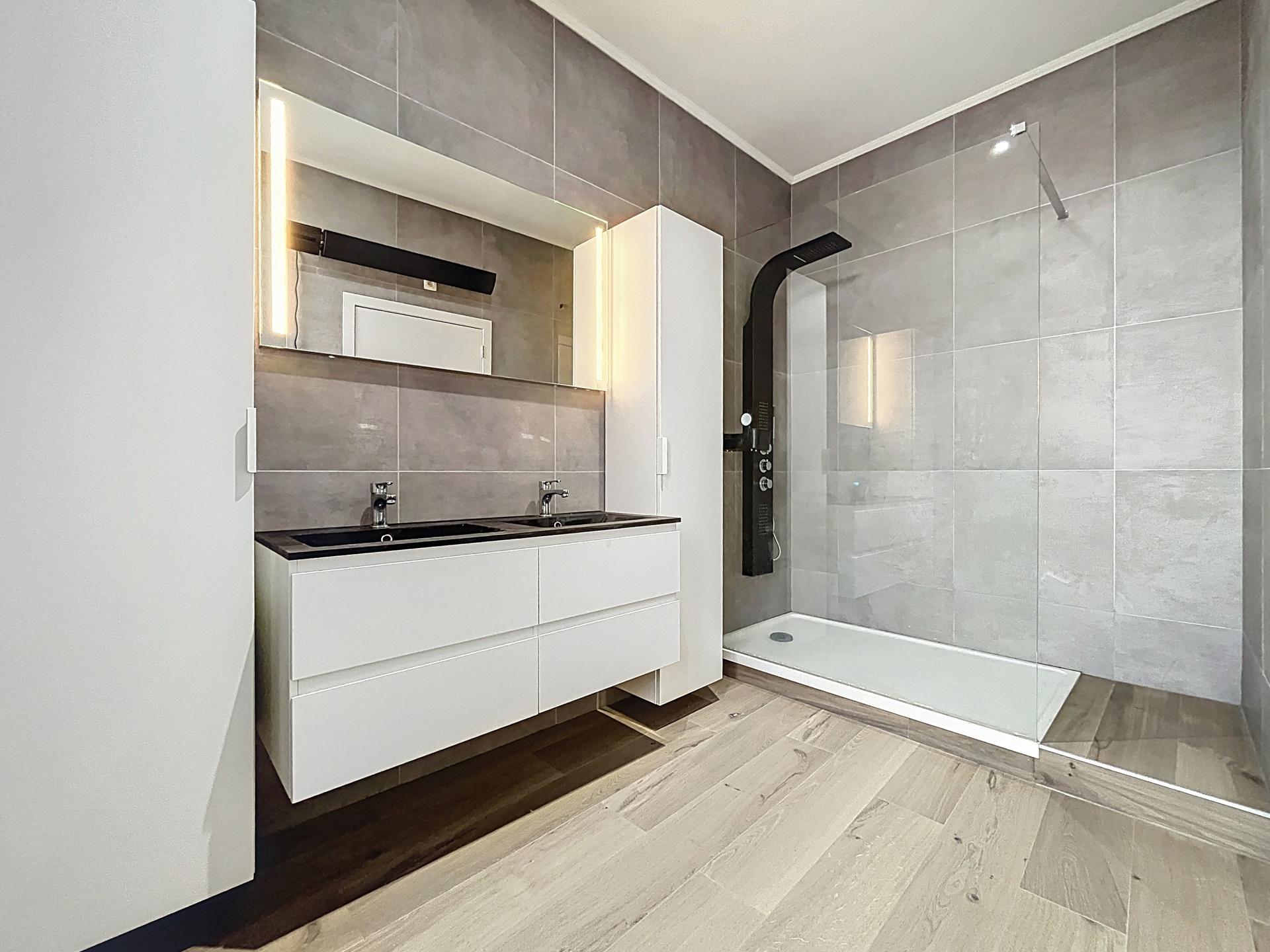 De badkamer is uitgerust met een instap regendouche en een dubbele wastafel met bijhorend badkamermeubel.