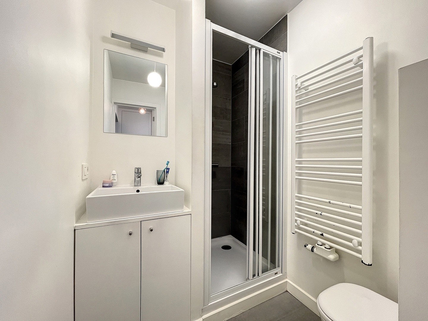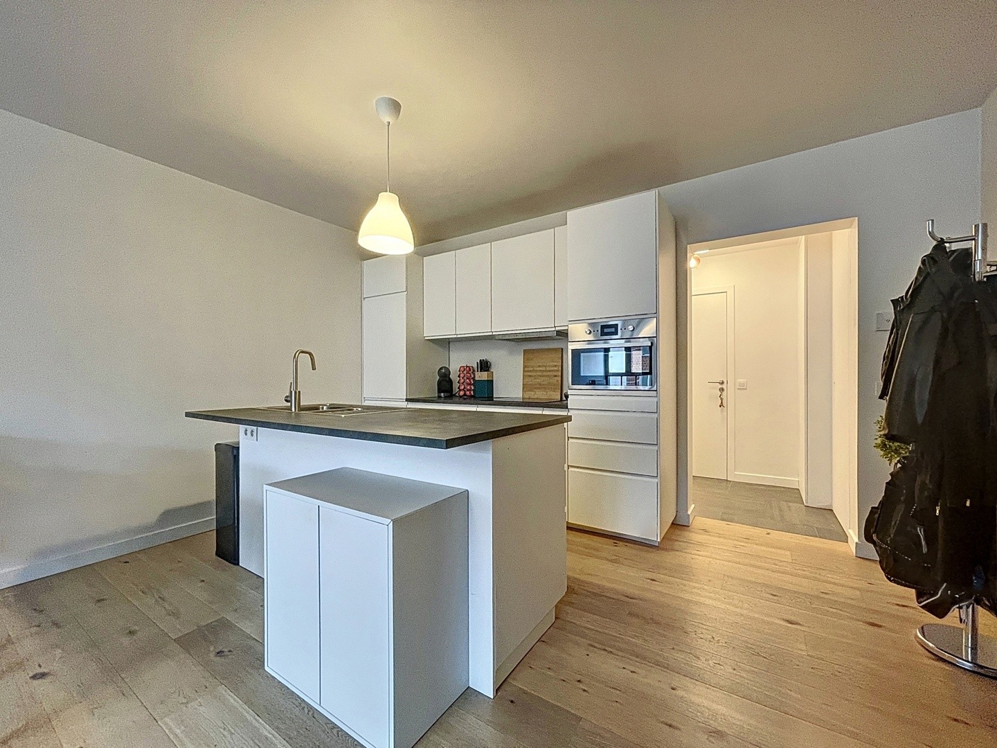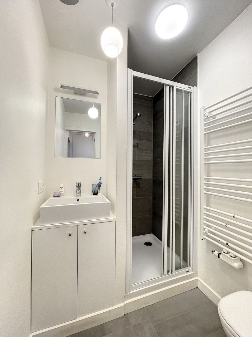 U betreedt het appartement in de inkomhal met directe toegang tot de badkamer met douche. De leefruimte met open keuken is voor zien van alle nodige toestellen en geniet van veel natuurlijk licht. Tenslotte is de ruime slaapkamer terug te vinden.