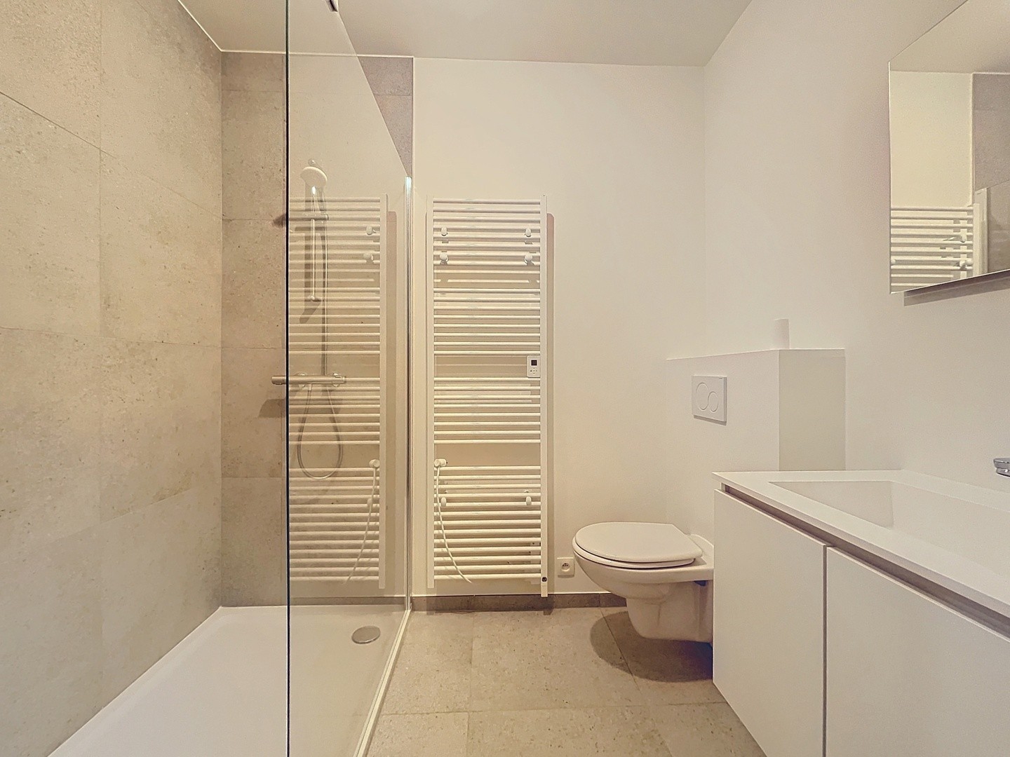 Dit nieuwbouw appartement bestaat uit een inkomhal, toilet, lichtrijke ruime leefruimte met open volledig ingerichte keuken en een praktische berging/wasplaats. De master bedroom beschikt over een eigen badkamer. Verder zijn er nog 2 slaapkamers terug te vinden met en een aparte geïnstalleerde badkamer. Het appartement geniet van een aangenaam privé terras met uitzicht op het park. Tevens is er een autostaanplaats voorzien in de ondergrondse parking, waar zich ook de fietsenberging bevindt. Het pand werd recent geschilderd en is voorzien van gordijnen en ingemaakte kasten. Er werd gebruik gemaakt van de nieuwste technieken zoals zonnepanelen, vloerverwarming via warmtepomp, ventilatiesysteem type C+, hoogrendementsbeglazing edm. waardoor het appartement voldoet aan de BEN normering.