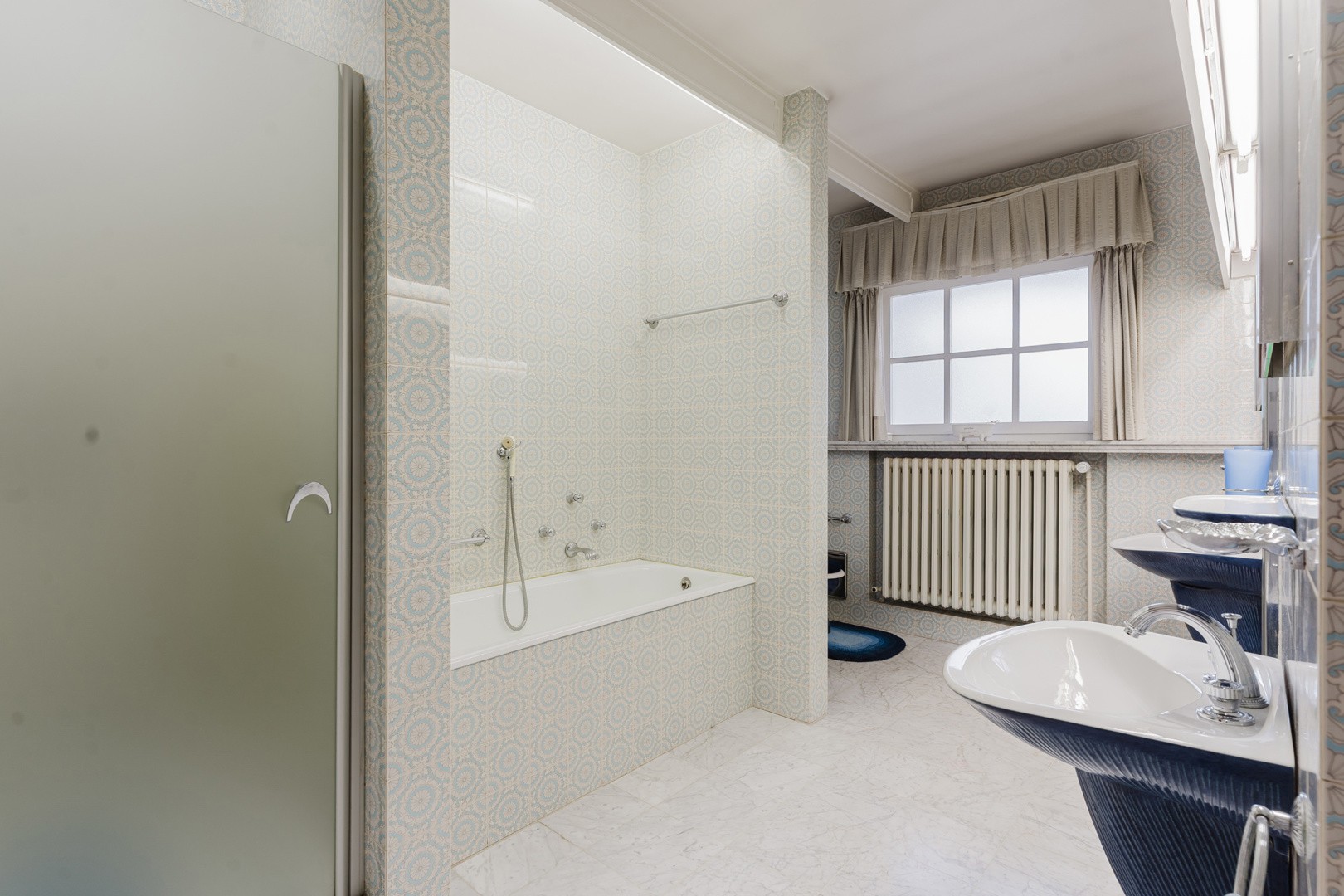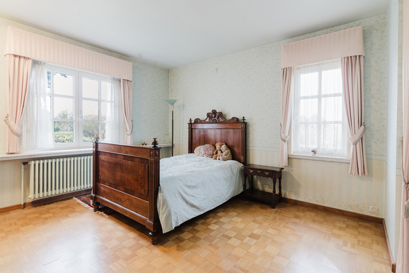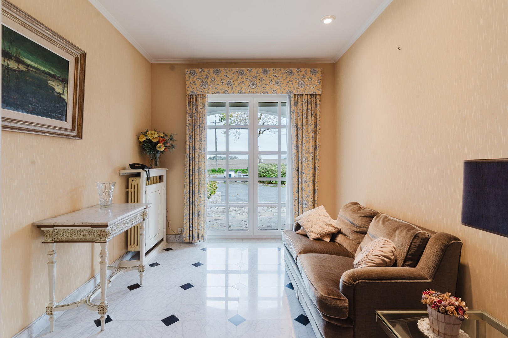 Op het gelijkvloers bevindt zich de gezellige woonkamer met zicht op de tuin en toegang tot het terras. Daaropvolgend vinden we de keuken, drie slaapkamers – waaronder een bijzonder ruime master bedroom – en de badkamer. De villa beschikt over twee inpandige garageplaatsen met directe toegang tot de woning, een ruime kelder en een indrukwekkende zolder van 180 m², met vaste trap, die nog volledig naar wens kan worden ingericht – ideaal voor extra kamers, een bureau of ontspanningsruimte.