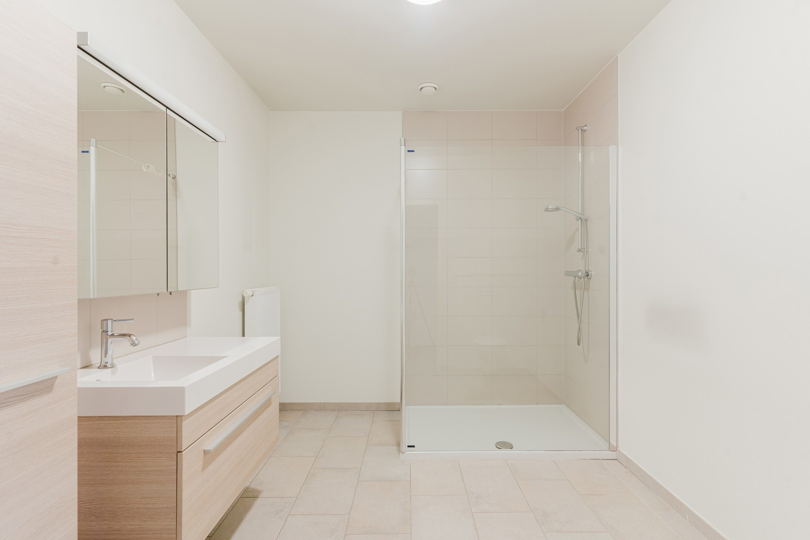 Bij binnenkomst tref je een inkomhal met vestiaire en apart toilet. De ruime, lichtrijke leefruimte met grote ramen geeft toegang tot het aangename terras met zicht op de kerk, waar je heerlijk kan genieten van een koffiemoment in de zon. De open, volledig ingerichte keuken sluit mooi aan bij de leefruimte en biedt alle comfort voor wie graag kookt. Verder beschikt het appartement over twee volwaardige slaapkamers, een badkamer met inloopdouche, en een praktische berging met aansluiting voor wasmachine.