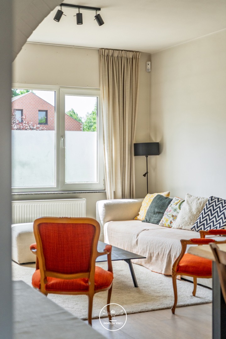 U komt binnen via een centrale inkomhal met gastentoilet. Van daaruit heeft u toegang tot de open, lichtrijke leefruimte, momenteel ingericht met een gezellige zithoek, bureauruimte en eetplaats. De volledig uitgeruste keuken met zicht op de tuin staat in verbinding met de woonkamer. Aansluitend vindt u een praktische berging en een kelder met extra opslagruimte.