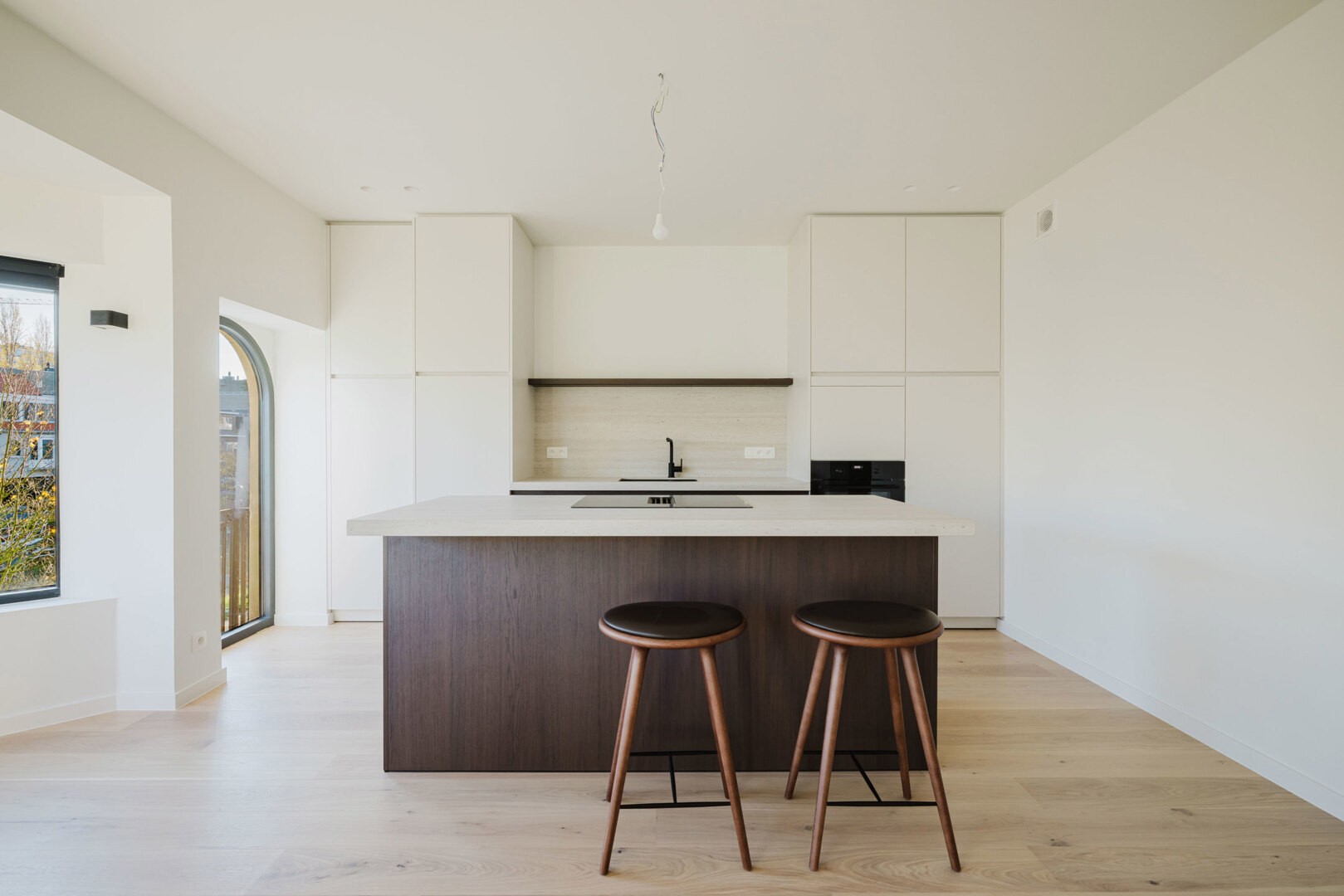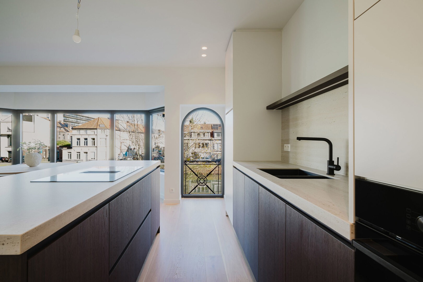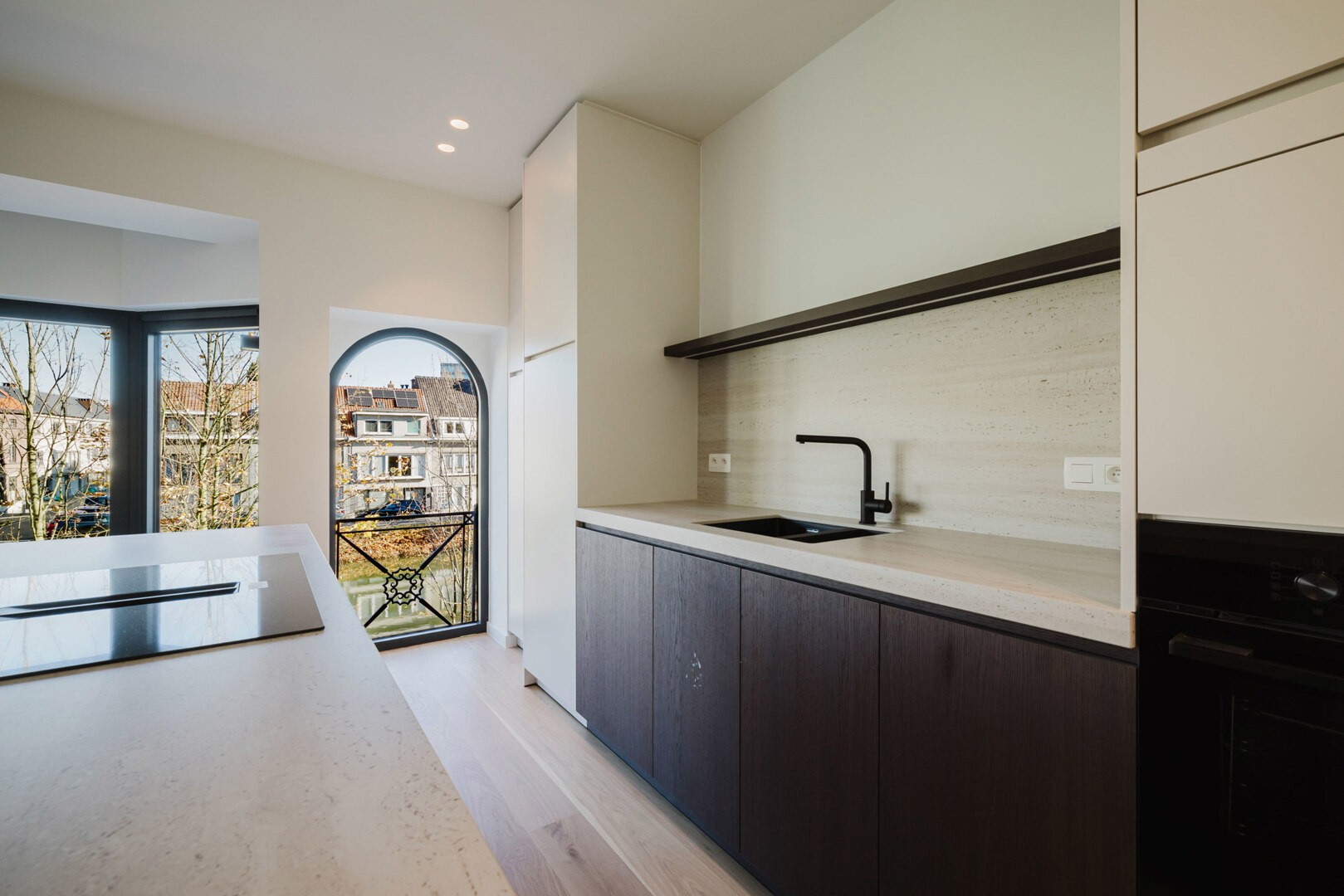 De designkeuken is volledig uitgerust met moderne toestellen en hoogwaardige afwerking.