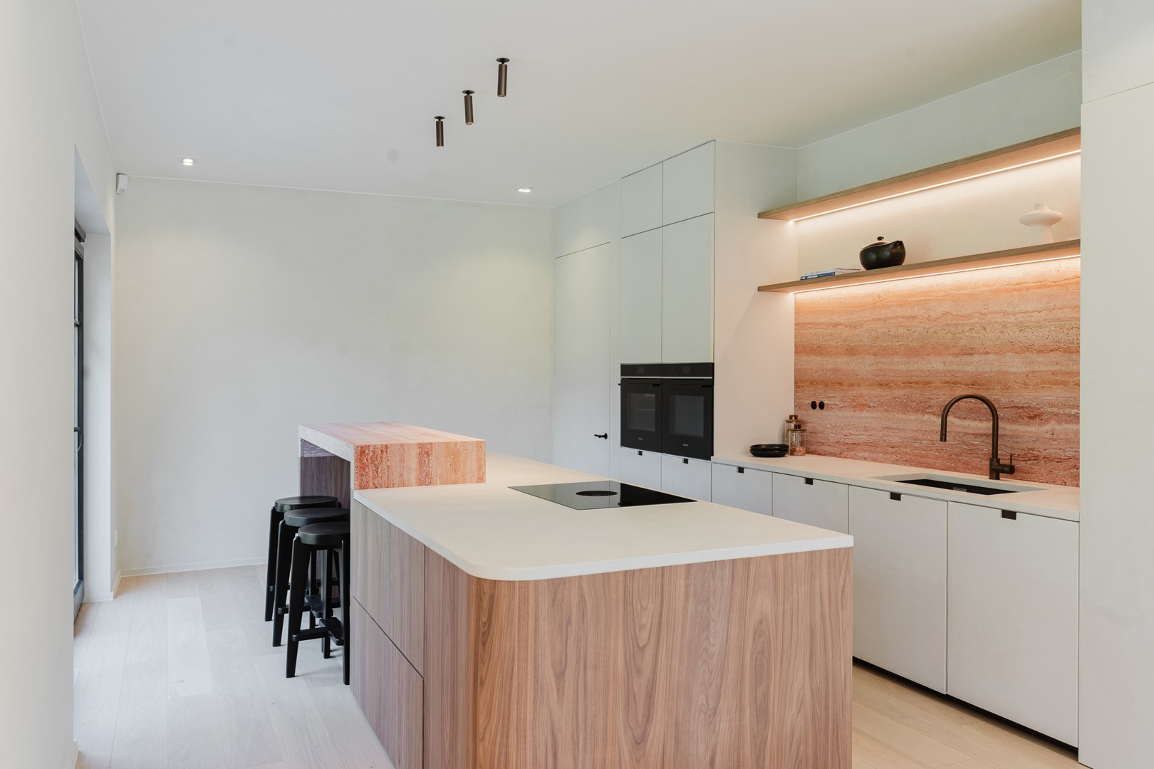 Het gelijkvloers bestaat uit een ruime inkomhal met open traphal, een afzonderlijke garage, het gastentoilet, de lichtrijke woonkamer met toegang naar het overdekt terras, de volledig ingerichte open keuken met hoogwaardige materialen (mortex, notelaar, travertin) die toegang biedt naar het 2de terras alsook de bergruimte. Via de achterdeur kan je rechtstreeks naar de benedenverdiep en de keuken. De bendenverdieping werd hoogwaardig afgewerkt en biedt tal van mogeliijkheden. (wijnkelder/wellness/fitness/wasplaats/home office)