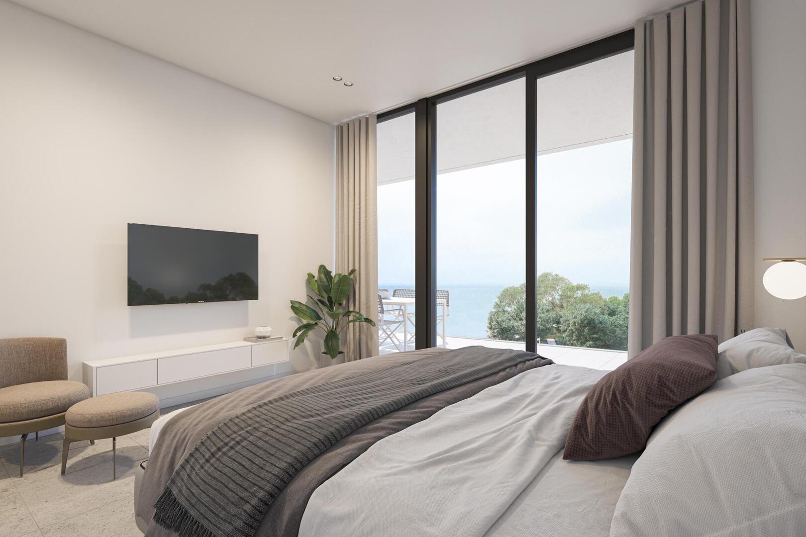 Het appartement heeft een terras met panoramisch zeezicht. Door de grote en hoge glaspartijen zijn alle ruimtes open en luchtig met veel lichtinval. U voelt als het ware de zee en het strand tot in uw zetel.