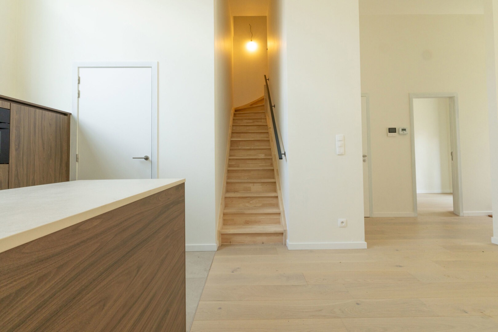 Apparement 9B is een ruime duplex in het binnengebied, weg van de straat en met zicht op de tuin. Via de inkom hebt u toegang tot de leefruimte met open keuken. De hoge plafonds springen onmiddellijk in het oog. De keuken is volledig geïnstalleerd. Naast de keuken is er een zeer grote bergruimte, met aansluiting voor was- en droogkast.